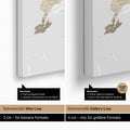 Slim-Line (2 cm) offers a flat look with subtle shadows. Gallery-Line (4 cm), on the other hand, provides a high-quality gallery look with strong shadows. In addition, the 4 cm frame gives extra stability, which is particularly recommended for larger push pin canvases from 160 cm.