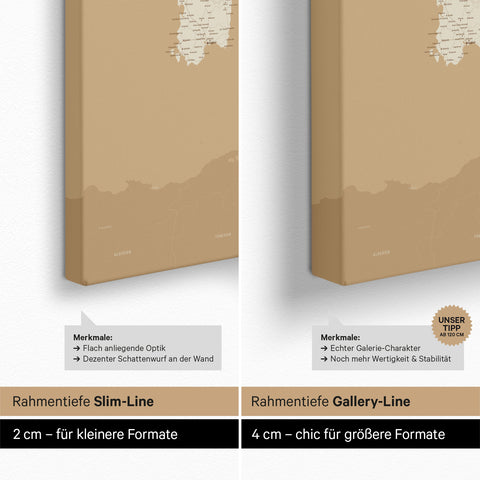 Vergleich der Rahmentiefe unser Weltkarten Pinn-Leinwand, zwischen Slim-Line mit 2 cm Tiefe und Gallery-Line mit 4 cm Tiefe